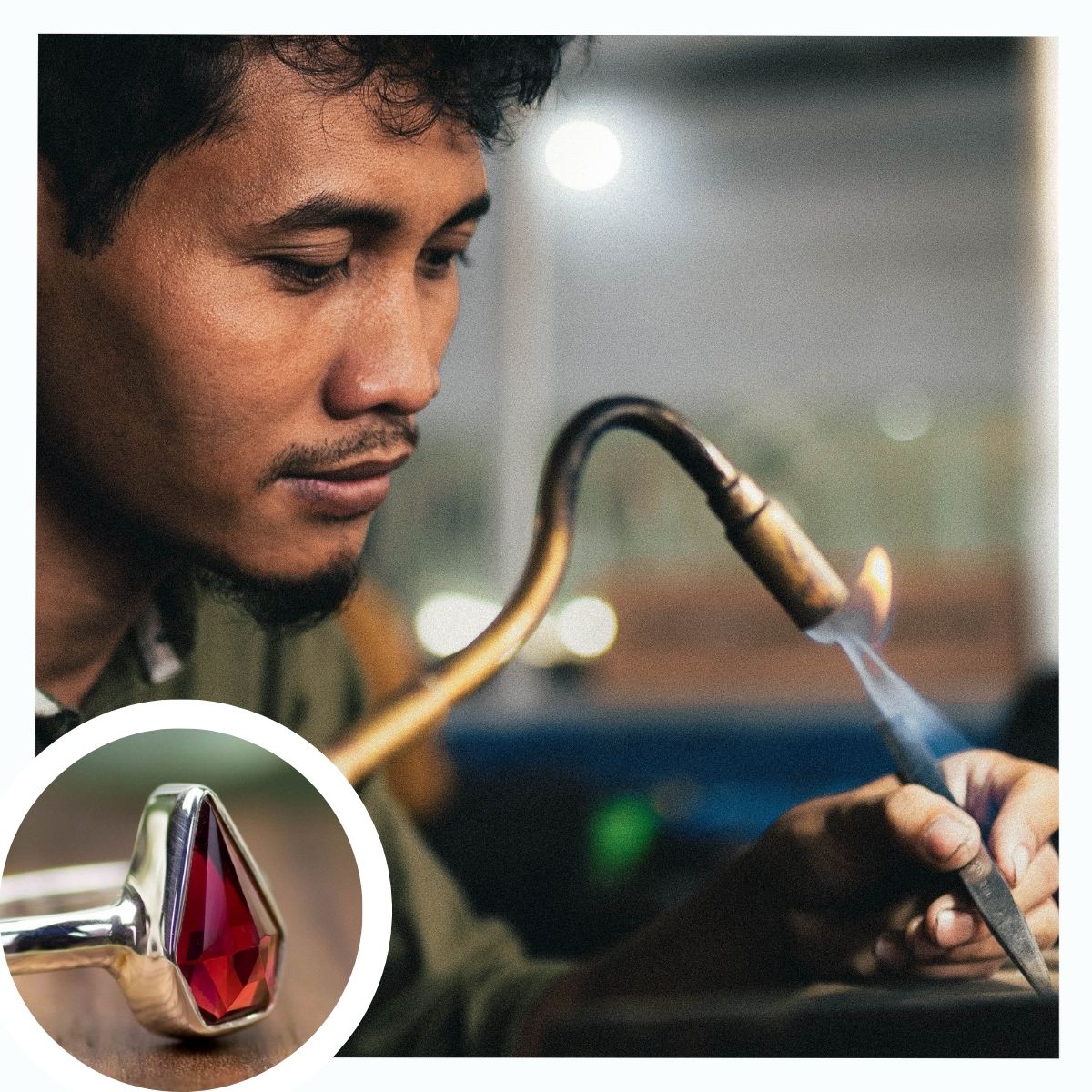 Genau zehn Ringe mit feuerrotem Granat in Form einer Flamme und verspieltem Rosenschliff, stehen zur Auswahl. Dabei gleicht kein Stein dem anderen, sodass es sich hier ausschließlich um Einzelstücke handelt.