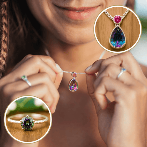 Der echte Mystische Topas entfaltet mit jedem Lichteinfall ein faszinierendes Farbspiel von Grün, Blau und Violett. Durch seinen präzisen Schliff wird er zum strahlenden Highlight, das sofort Aufmerksamkeit auf sich zieht und Deine Einzigartigkeit unterstreicht.
