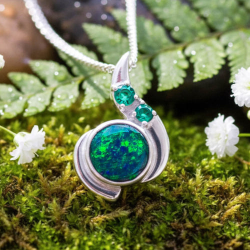 Diese liebevoll designte Opal-Halskette ist ein wahres Unikat und hebt sich deutlich von herkömmlichem Schmuck ab. Der zentrale Blickfang ist eine seltene australische Opal-Triplette mit einem beeindruckenden Durchmesser von 9 mm – eine Größe, die heute kaum noch zu finden ist.