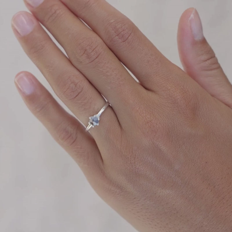 Dieser Solitär Ring setzt den hochwertigen 5mm Salz & Pfeffer Diamanten, mit Rosenschliff, in den Fokus. Unsere Edelsteine stammen aus Botswana, sie werden dort in kleinem Umfang und umweltschonend abgebaut. Jeder Diamant wird von Hand geschürft und ist dadurch einer der unschuldigsten Edelsteine. Der Ring gehört zu den Premium Ringen unserer Silber Kollektion. Er ist der perfekte Verlobungsring und ideal für alle diejenigen, welche Wert auf Qualität und Design legen. Mit diesem Ring sind bewundernde Blicke und Komplimente garantiert!