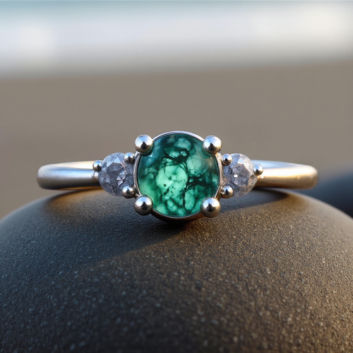 Dieser faszinierende Trilogie-Ring ist die perfekte Möglichkeit, die einzigartige Geschichte Deiner Liebe festzuhalten. Er besticht durch zeitlose Eleganz und symbolisiert die Vergangenheit, Gegenwart und Zukunft. Auch steht er für neue Lebensabschnitte. In der Mitte prangt ein strahlender Moosachat, flankiert von zwei glänzenden Salt & Pepper Diamanten.