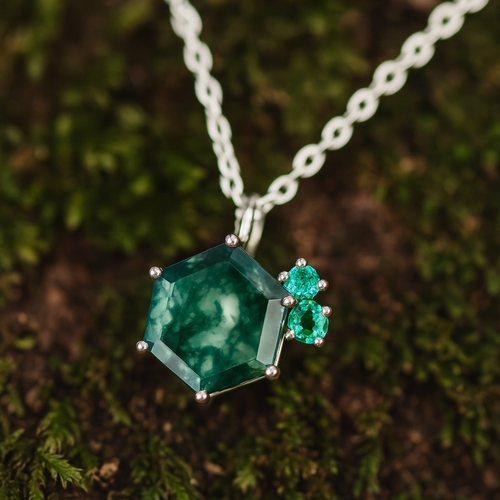 Genieße die natürliche Schönheit eines Moosachats & tiefgrüner Smaragde in hochwertigem 925 Sterling Silber. Die stabile Kette, sowie das hypoallergene & wasserfeste Material des Anhängers, garantieren langanhaltenden Tragekomfort.